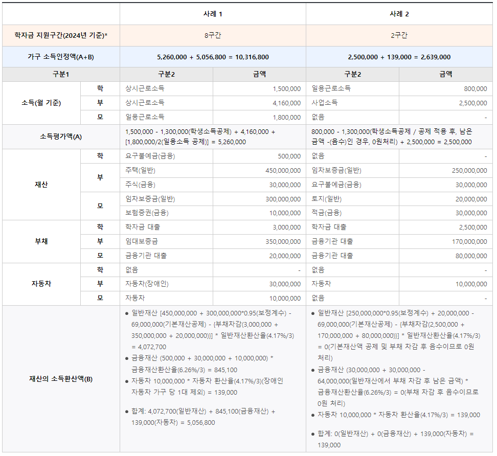 아래 예시표와 같이 각 정보를 입력하면 나의 지원 구간(장학금 지급금액)을 확인할 수 있습니다.
